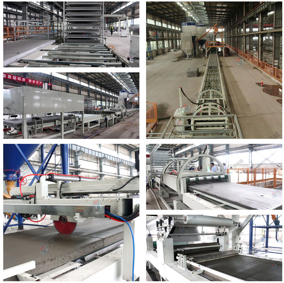 成型輸送線主要由上板輸送線、成型輸送線,加速整理輸送線及送板主機、布料主機、刮平裝置、玻纖網(wǎng)格布架等組成,主要功能是把漿料鋪設(shè)在EPS基板上并完成產(chǎn)品的成型,且輔助完成兩端雙工位碼垛機的上下架。