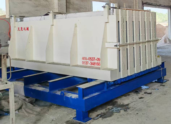 工作原理:模具的開合由下方的液壓機(jī)構(gòu)完成,和墻板機(jī)類似。合模后的鎖緊由上方和兩端的拉桿裝置實(shí)現(xiàn)。下方的強(qiáng)制同步裝置保證了大板在開合時(shí)的兩側(cè)同步。大板下方的輪組保證了大板在開合時(shí)不傾斜、不倒伏。